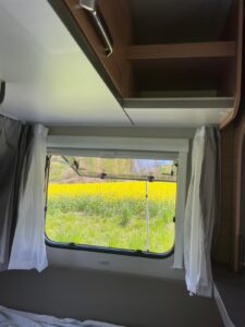 Gemütliches Doppelbett + umbaubare Sitzgruppe für zwei weitere Schlafplätze.